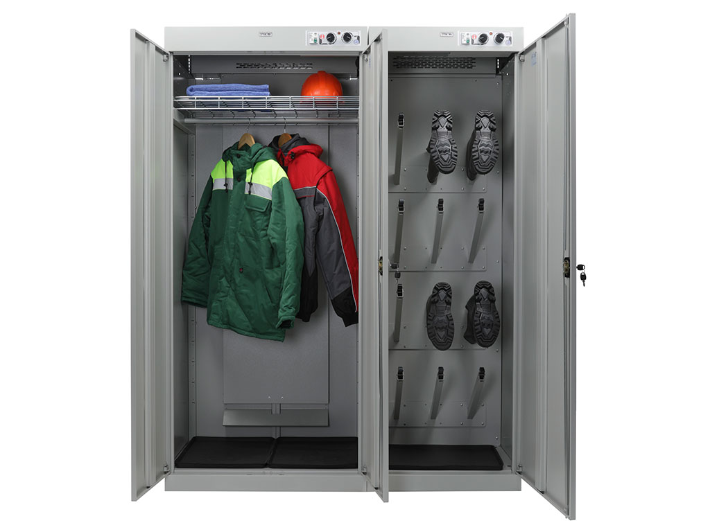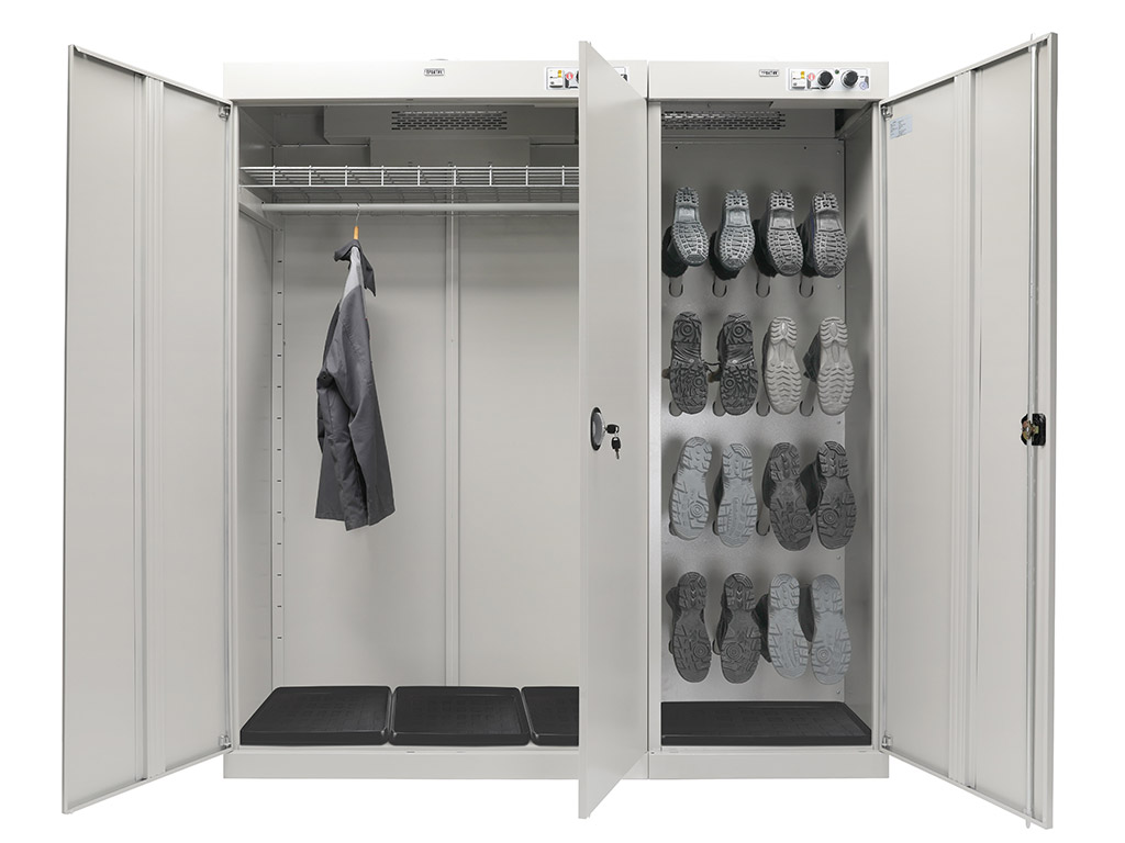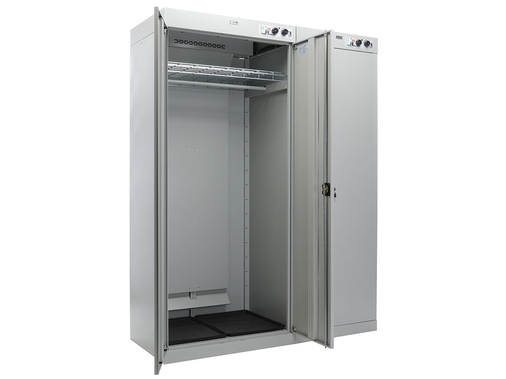 Professional drying cabinet-with increased drying characteristics of clothing and shoes The cabinet consists of two independent sections. The first two-door for clothes, with a crossbar for hangers and a shelf. The second-for drying shoes, equipped with pipes for hanging. Each shoe nozzle is equipped with an inertial valve that blocks the air supply if the shoes are not worn.