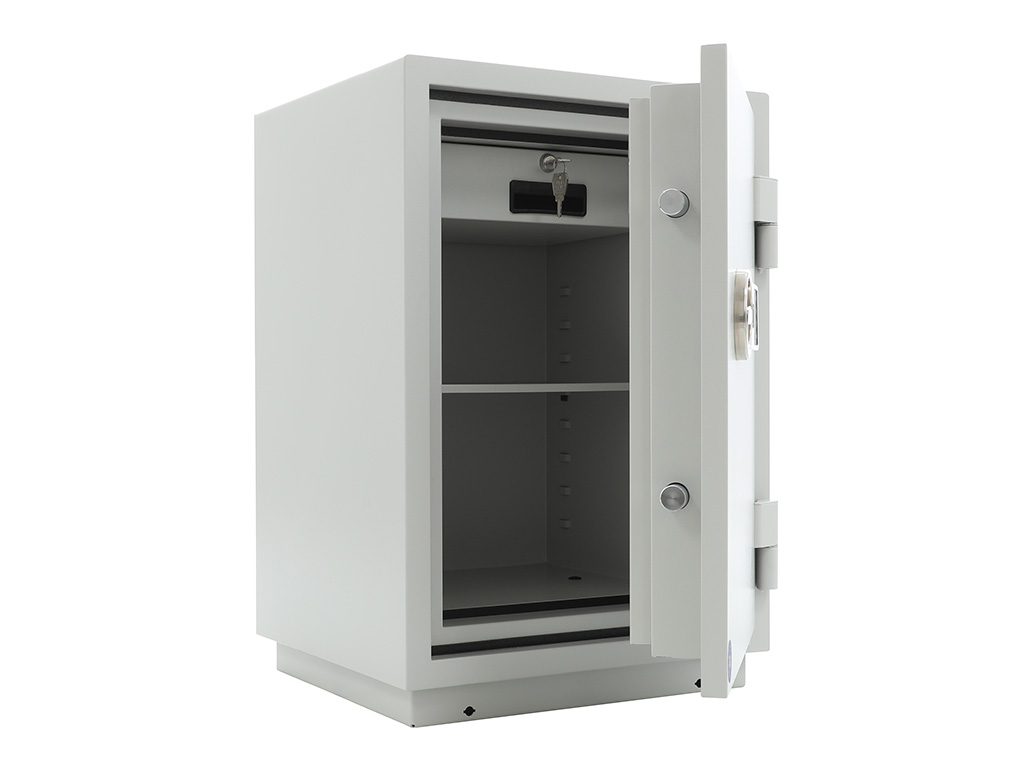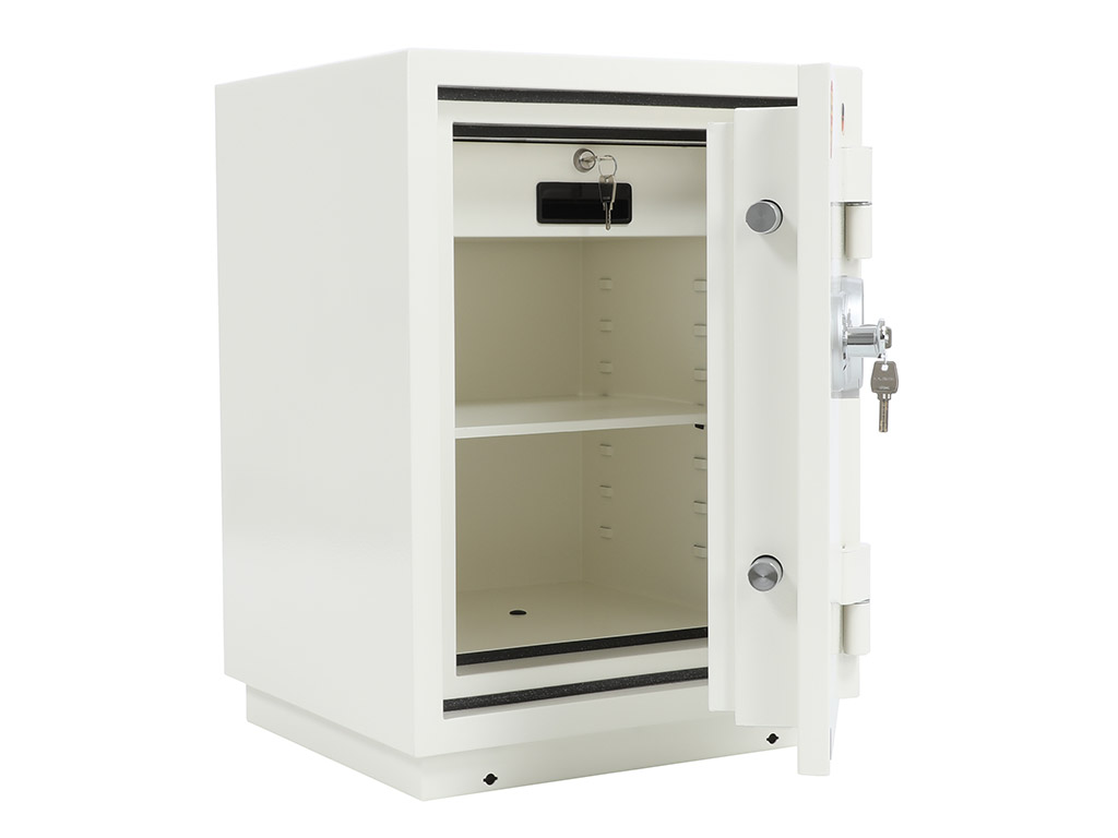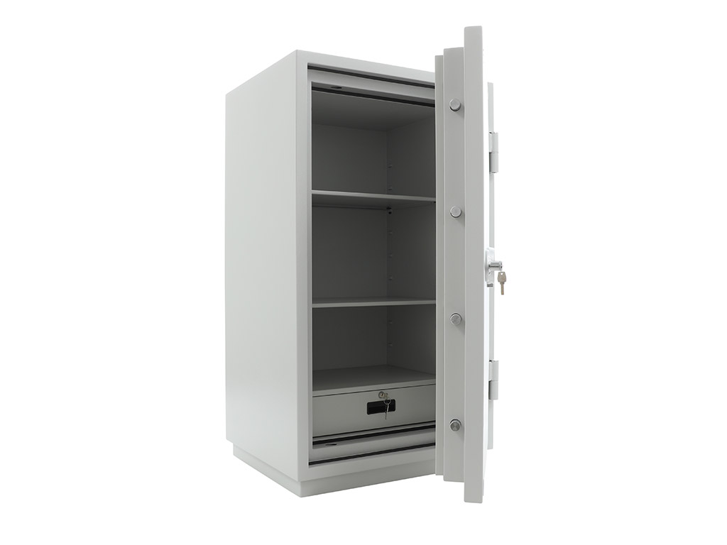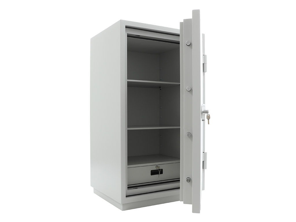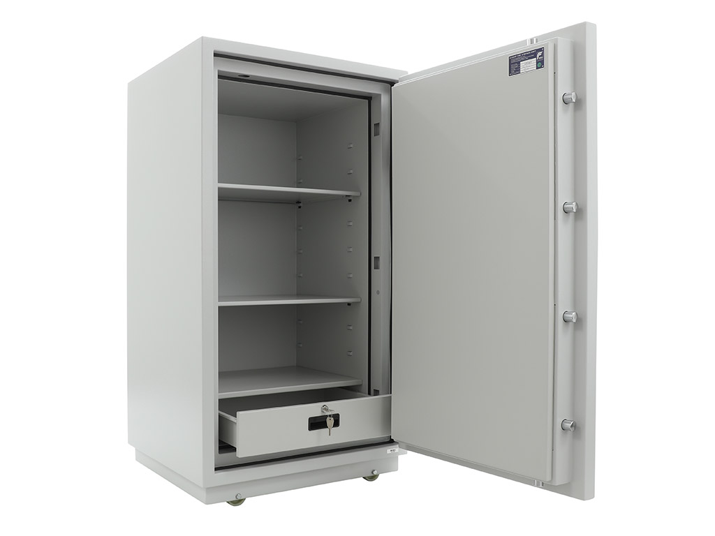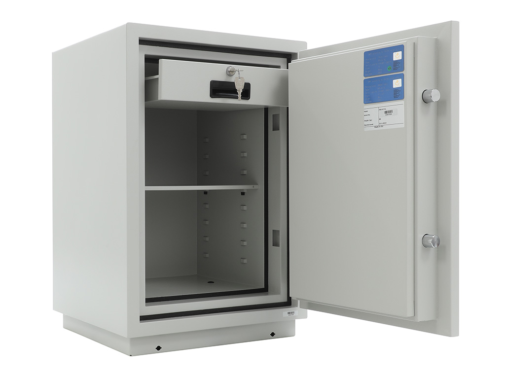 - The safe body and door are manufactured with two inter-welded walls that are filled with fire resistant concrete. Pull out tray or drawer included.