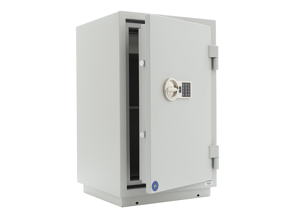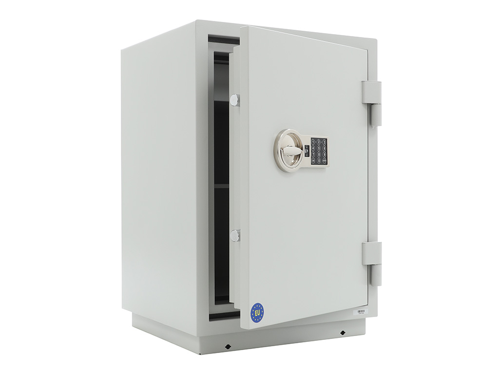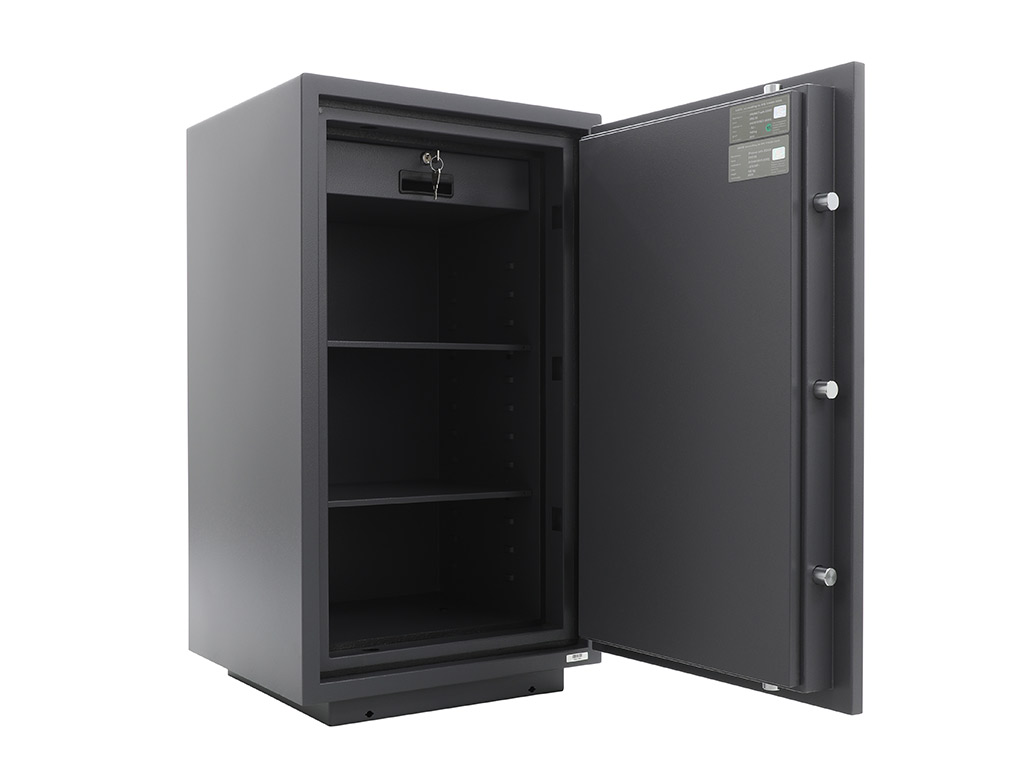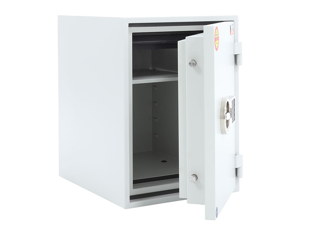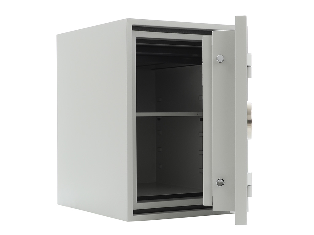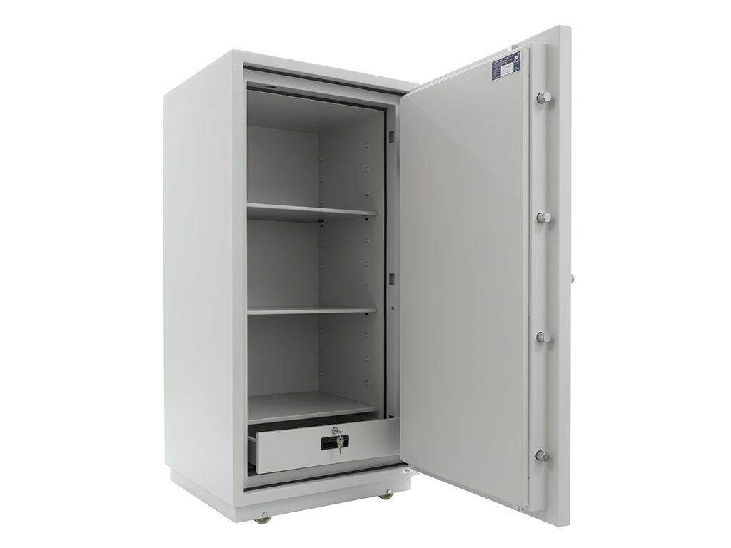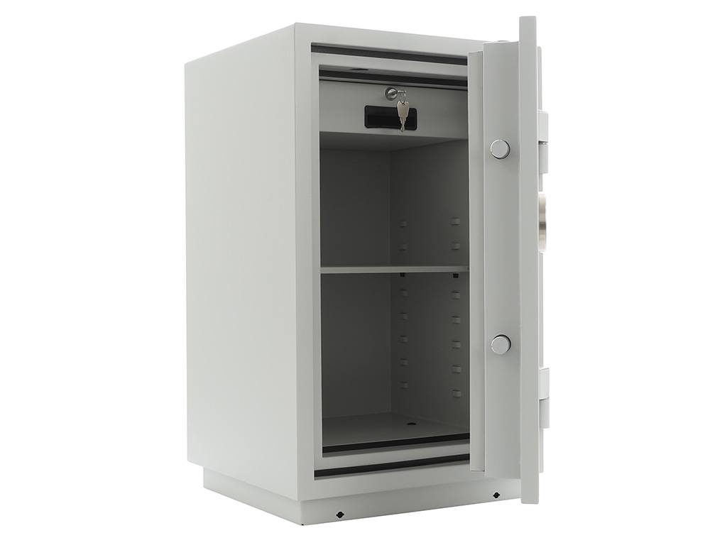 - The safe body and door are manufactured with two inter-welded walls that are filled with fire resistant concrete. Pull out tray or drawer included.