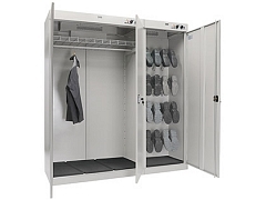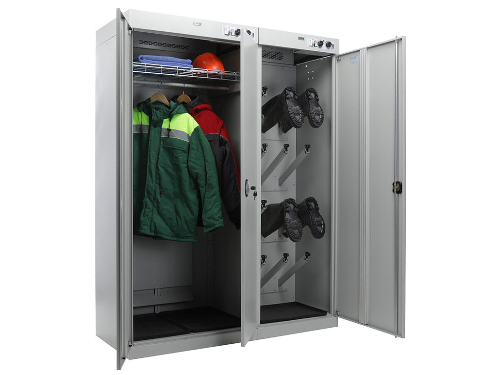 Professional drying cabinet-with increased drying characteristics of clothing and shoes The cabinet consists of two independent sections. The first two-door for clothes, with a crossbar for hangers and a shelf. The second-for drying shoes, equipped with pipes for hanging. Each shoe nozzle is equipped with an inertial valve that blocks the air supply if the shoes are not worn.