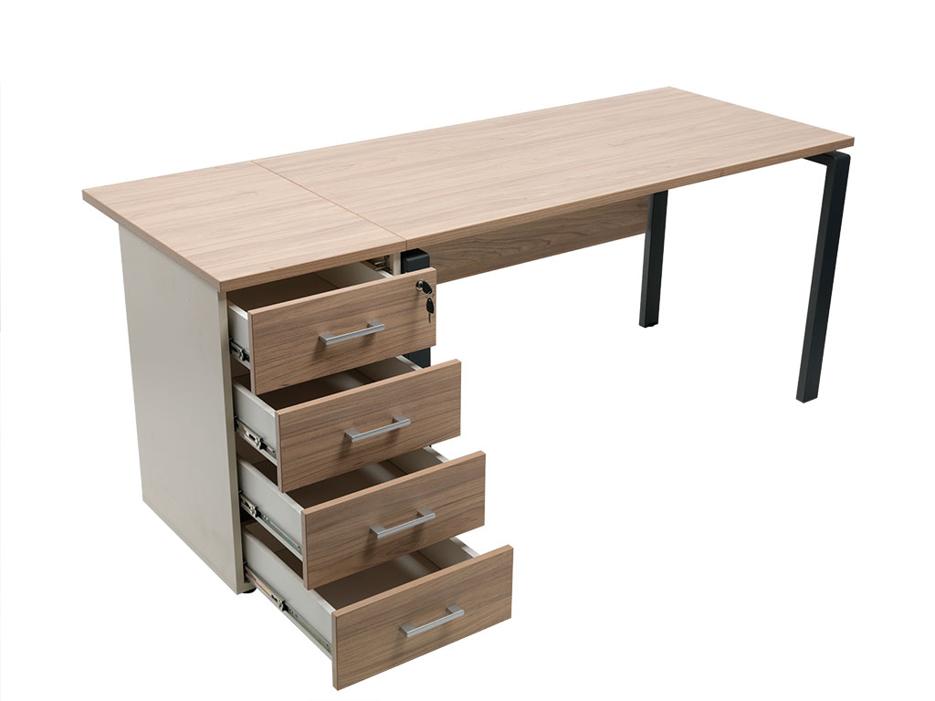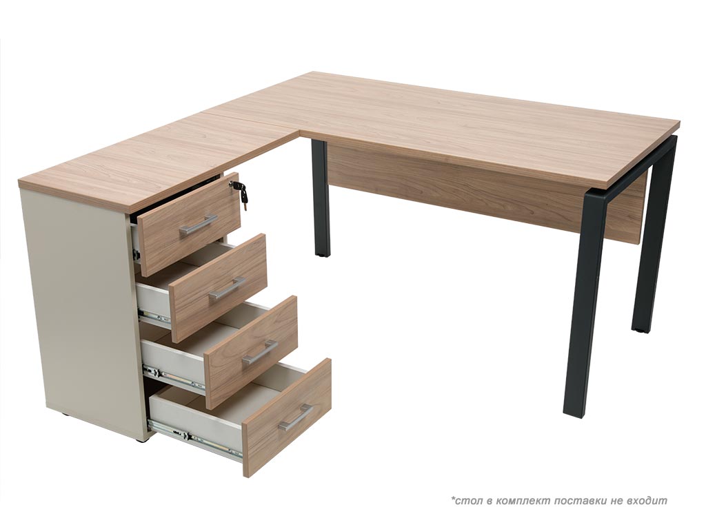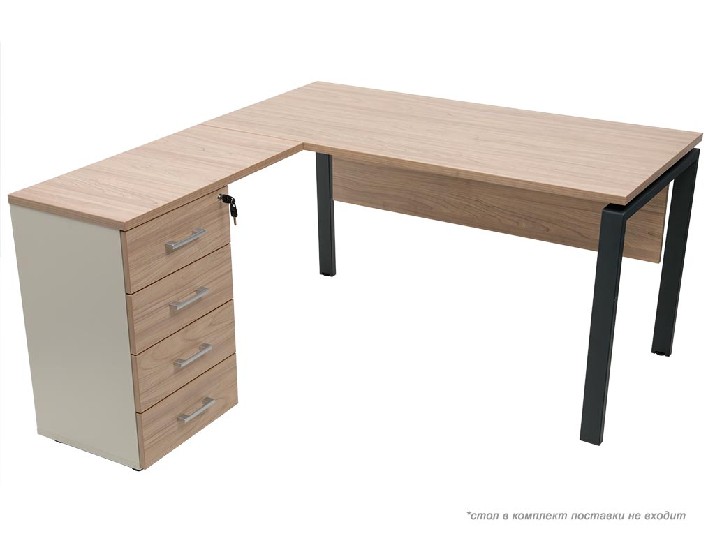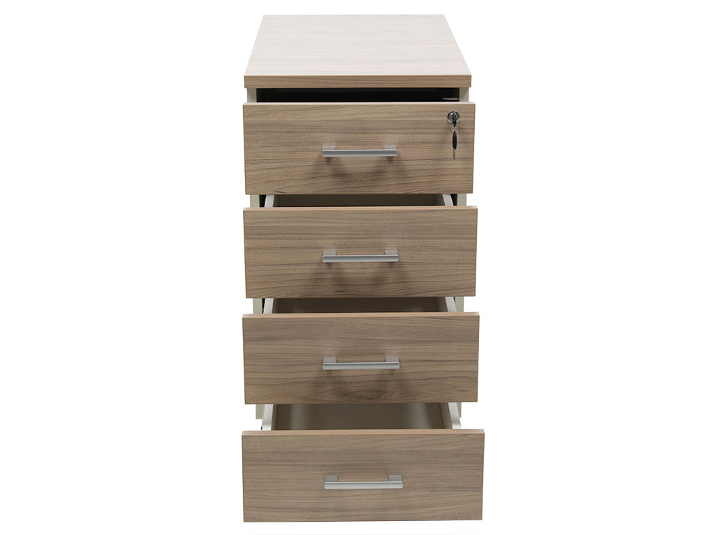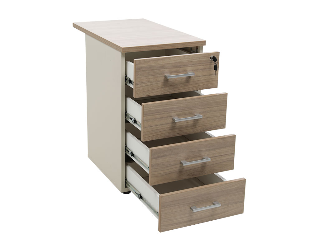 - The pedestal body and front panels are made of 18mm laminated chipboard, with a laser ABS edge with a thickness of 2 mm with a polymer functional layer, which provides a zero seam effect and improves the moisture resistance and heat resistance. Chipboard top with a thickness of 25 mm, laser ABS edge with a thickness of 2 mm