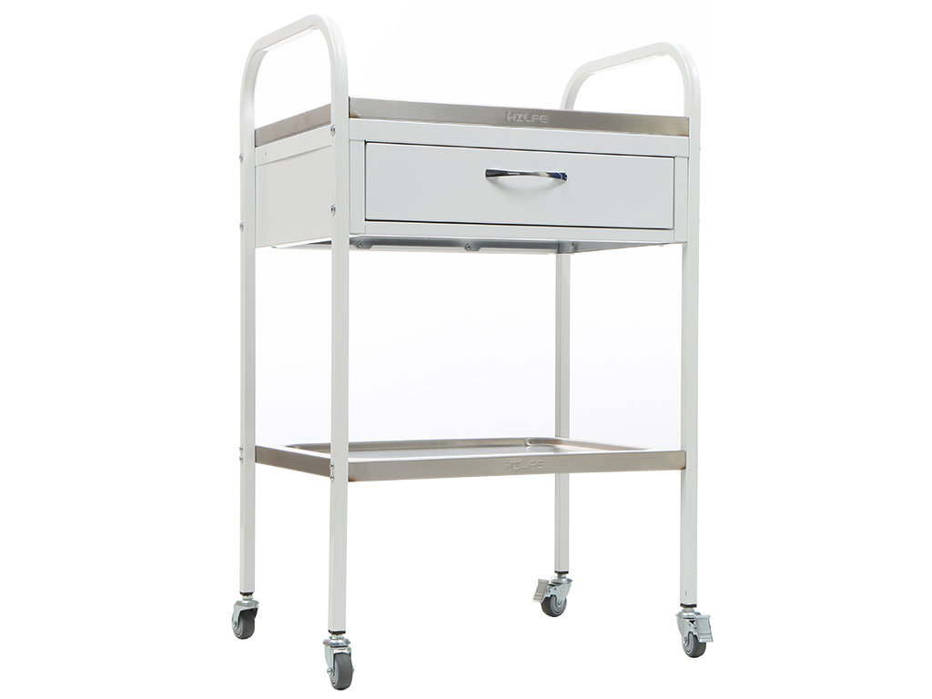 Treatment tables for hospitals, clinics, laboratories, sanatoriums and other medical facilities are represented by a series of manipulation and treatment tables Hilfe. Depending on the design, they can be used for the placement of instruments, injection and infusion solutions, or for the storage of tablet medicines, ointments and dressings. Given the necessary mobility, all models of the series are made mobile. Thanks to the self-orienting wheels D= 50 mm, they can easily move on any type of floor coverings of medical institutions.