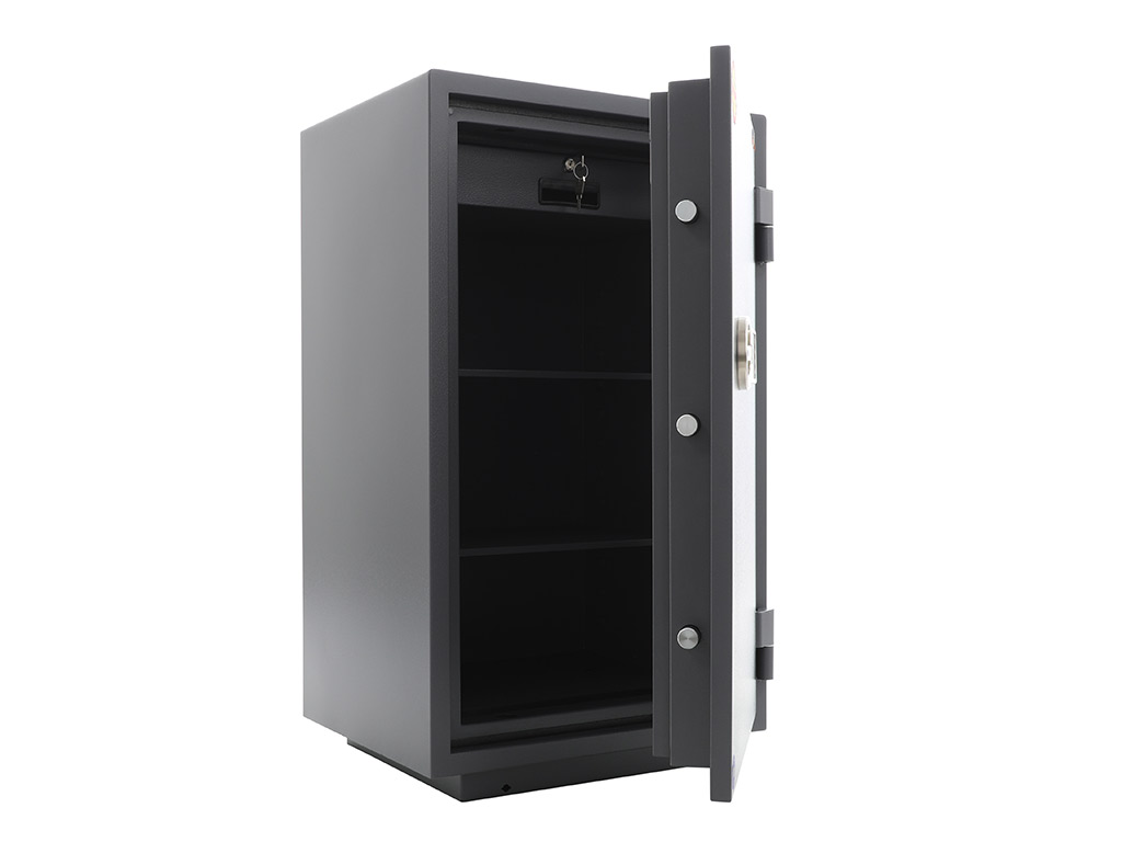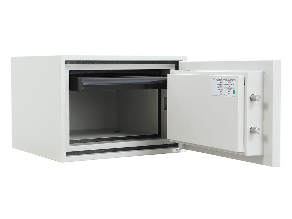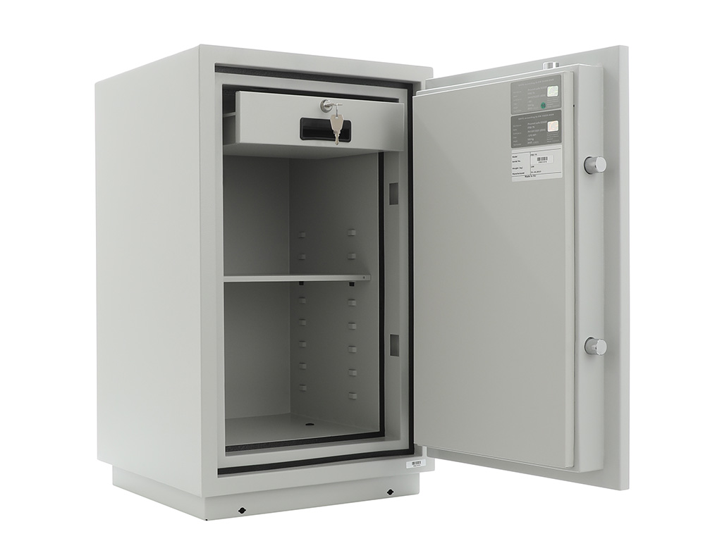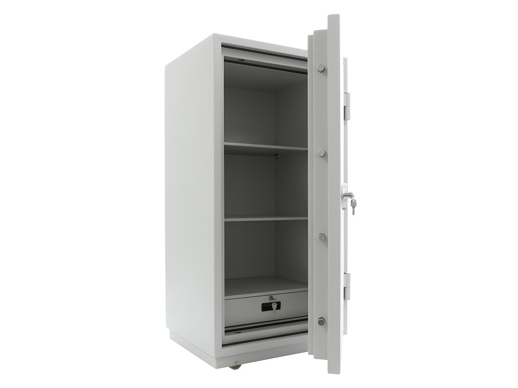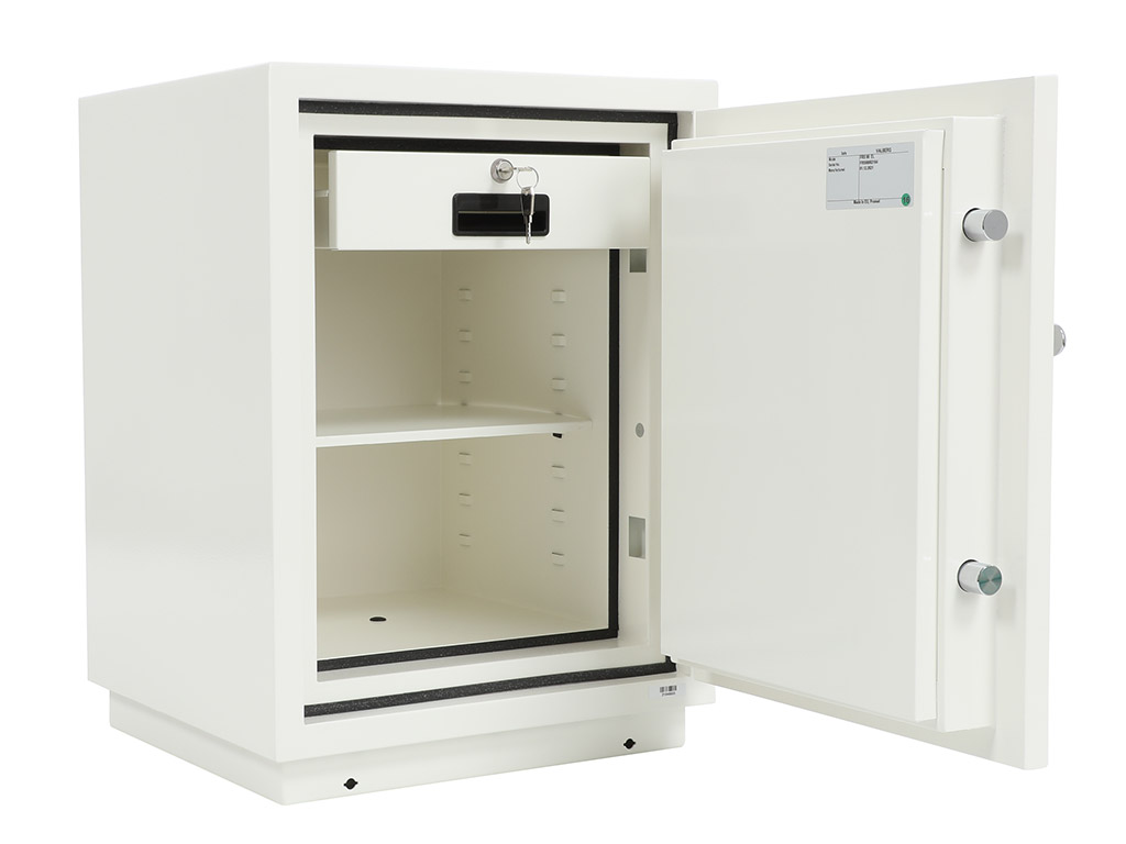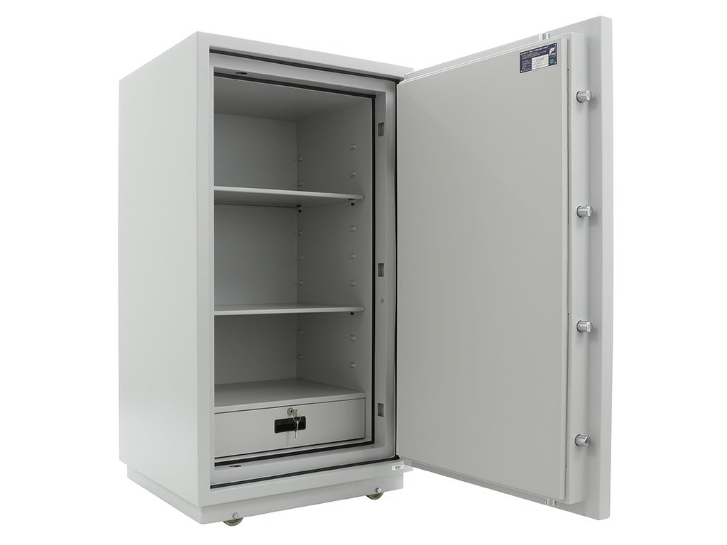 - The safe body and door are manufactured with two inter-welded walls that are filled with fire resistant concrete. Pull out tray or drawer included.