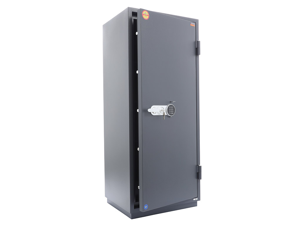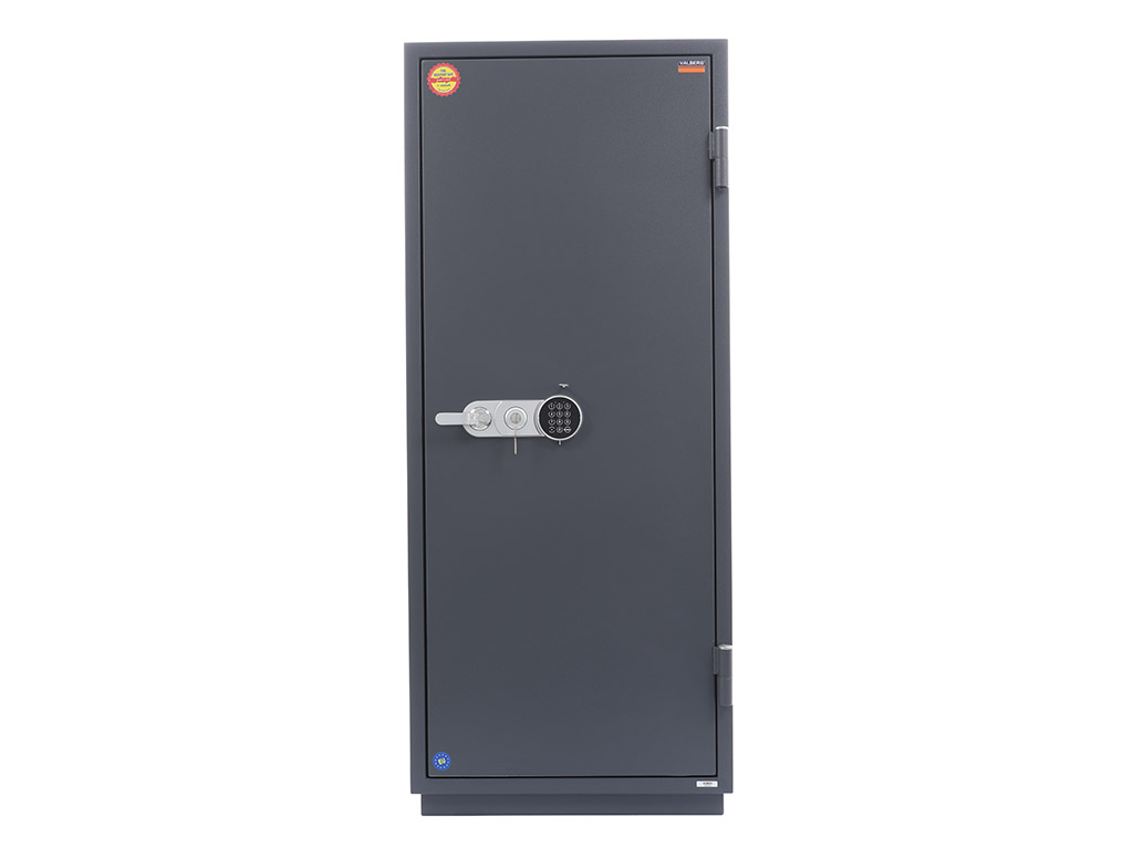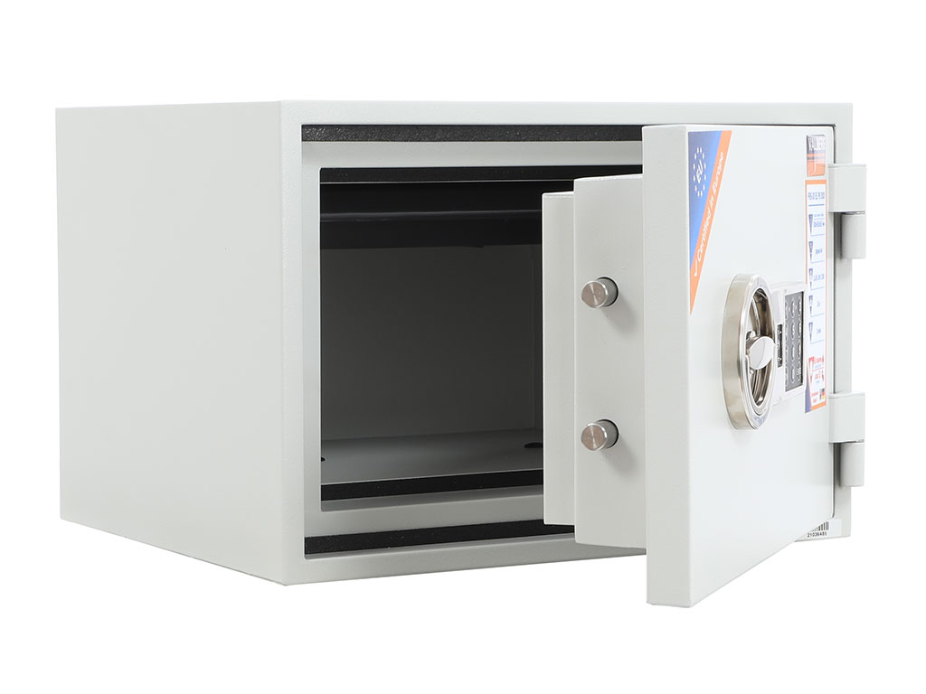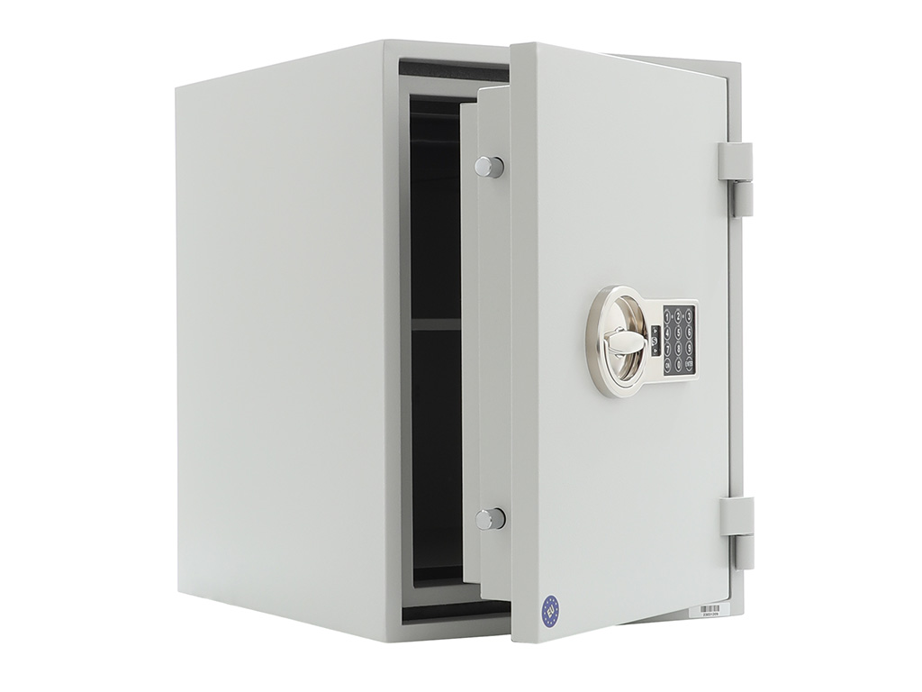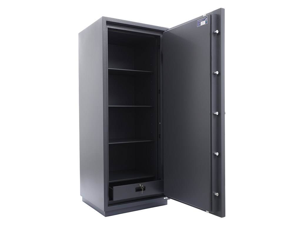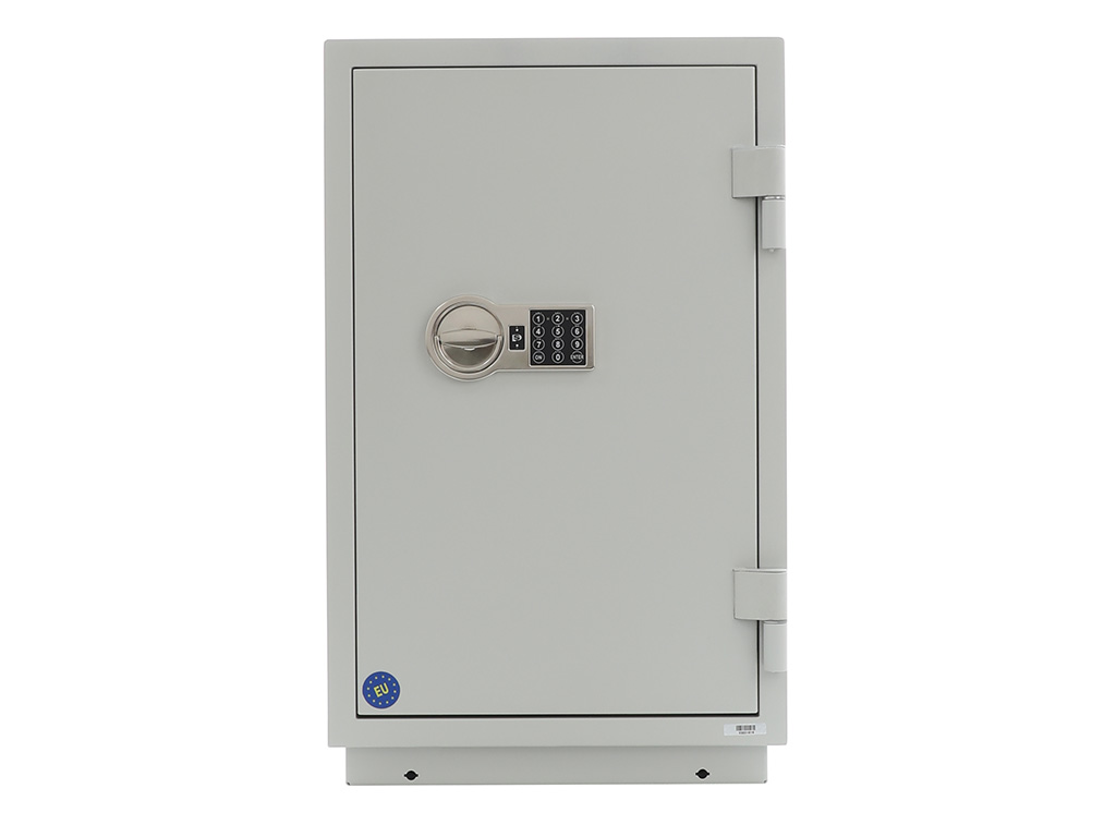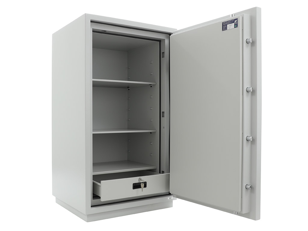 - The safe body and door are manufactured with two inter-welded walls that are filled with fire resistant concrete. Pull out tray or drawer included.